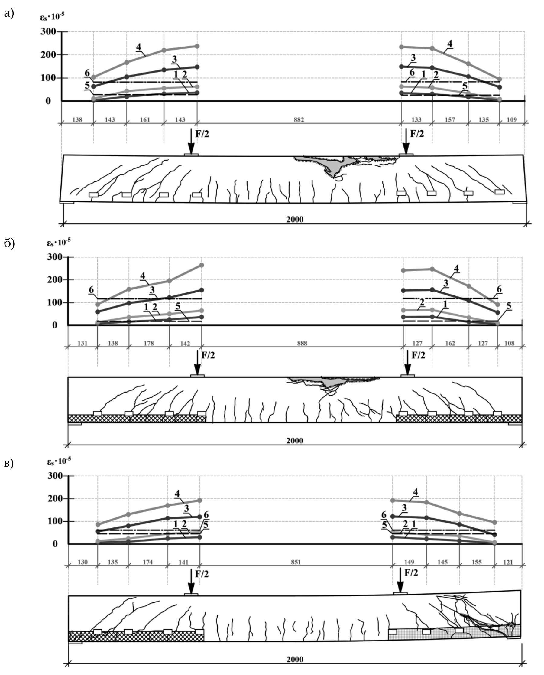 Рис. 8. Деформации арматуры в зонах поперечного изгиба образцов 1-й серии: а – эталонный образец (F⁰ᵤₗₜ = 56,04 кН); б – образец со степенью разрушения защитного слоя χ = 0,5 (F⁰ᵤₗₜ = 35,0 кН); в – образец со степенью разрушения защитного слоя χ = 1 (F⁰ᵤₗₜ = 32,69 кН); 2 –при нагрузке 0,25 F⁰ᵤₗₜ; 3 – при нагрузке 0,55 F⁰ᵤₗₜ; 4 – при нагрузке 0,9 F⁰ᵤₗₜ; 5 – уровень нагрузки, соответствующий образованию нормальной трещины; 6 – уровень нагрузки, соответствующий образованию наклонной трещины