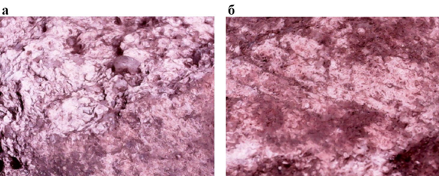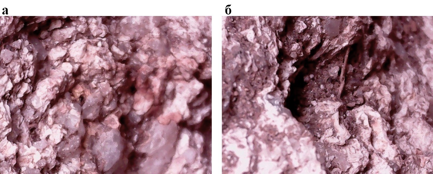 Рис. 12. Макрофотографии образца № 7: а – угловатое и округлое зерна кварца в цементе; б – зерна кварца в цементной массе