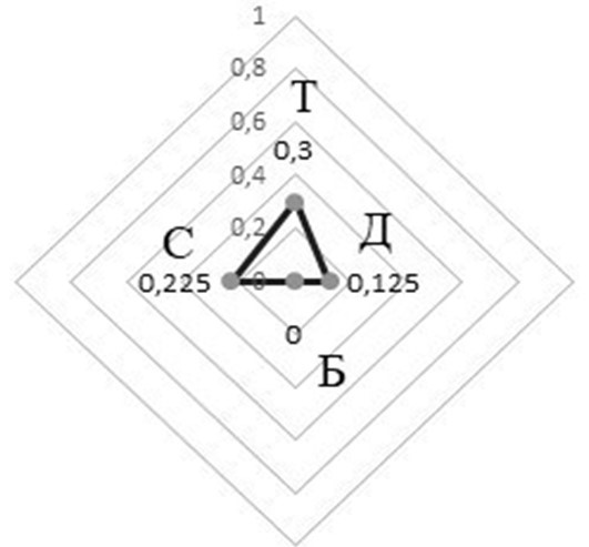 Рис. 4. Диаграмма оценки доступности МГН элементов функциональных частей поликлиники в Малоархангельске: Т – территория объекта; Д – пути движения; Б – зона безопасности; С – санитарно-бытовые помещения