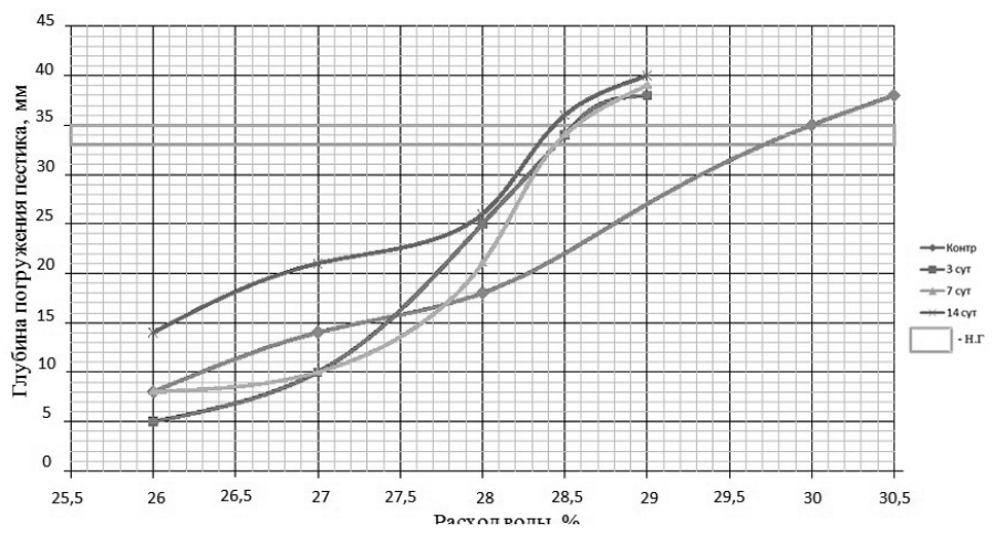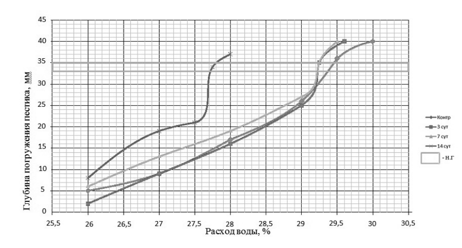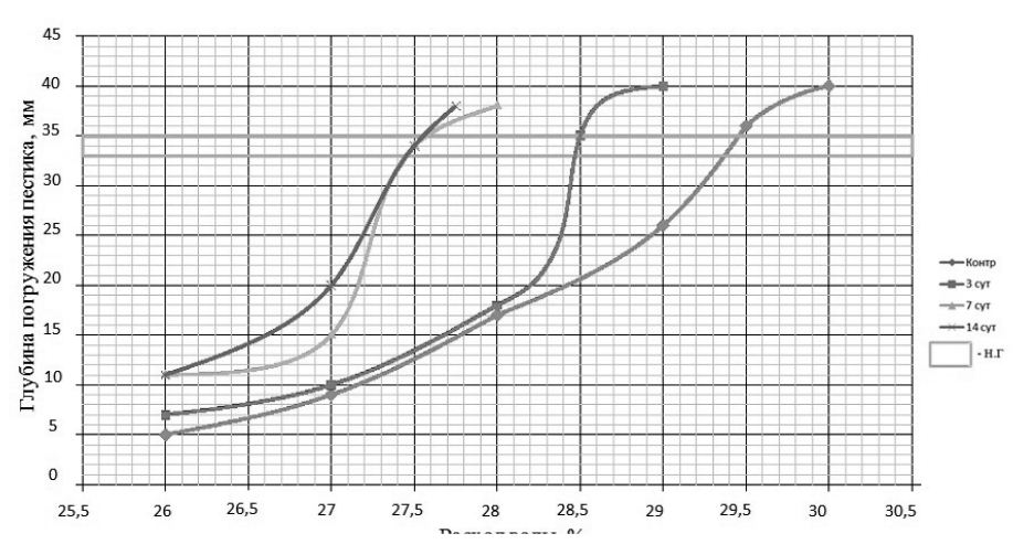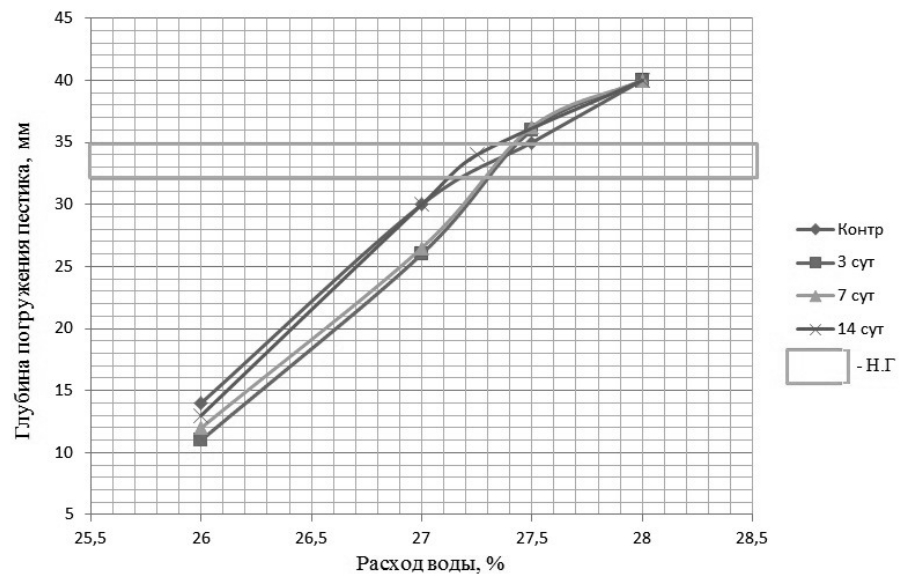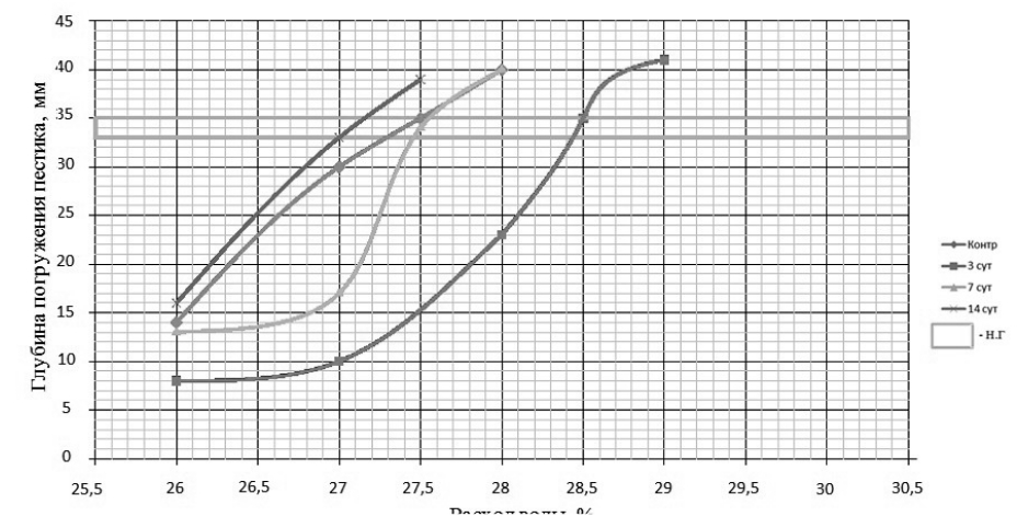 После необходимого времени выдержки проводились испытания по определению нормальной густоты цементного теста, при этом фиксировались промежуточные значения погружения пестика прибора Вика и определялось изменение его реологических характеристик для каждого из видов цемента и для жидкостей затворения, полученных из ДСП с эмиссией Е1(рис. 2‒4) и Е2 (рис. 5‒7).
