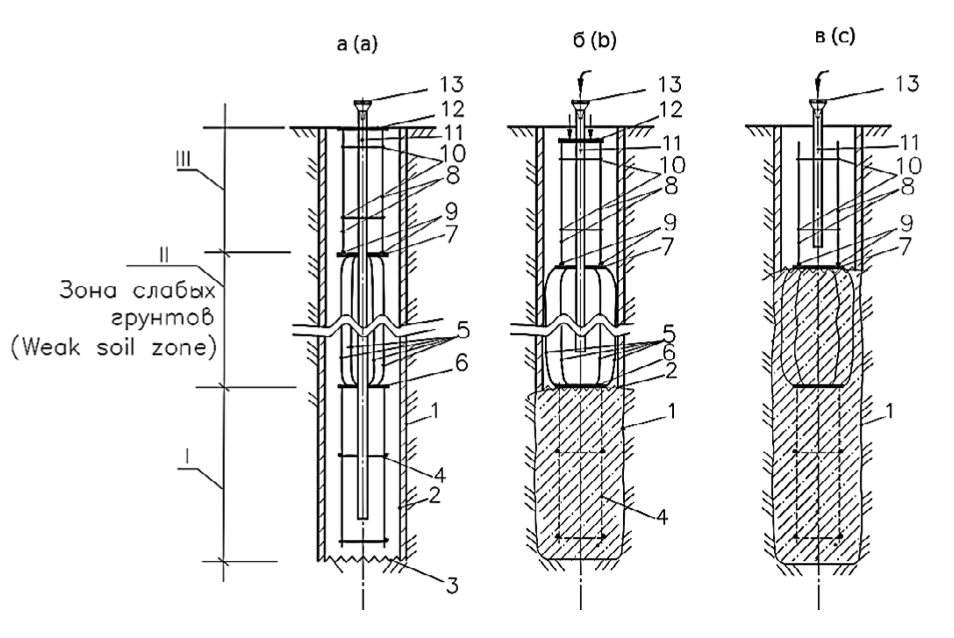 a – casing-held reinforcing cage, tremie pipe and work platform receiving and transmitting squeeze load; b – concrete mixture flowchart and partially concreted (bottom section) open bore pile; c – concrete mixture flowchart for the top section and concreted pile sections I and II: 1 – pile contour; 2 – casing pipe; 3 – cutters; 4 – reinforcing cage; 5 – middle-part reinforcing bars; 6, 7 – clamping discs; 8 – upper-part reinforcing bars; 9 – thrust washers; 10 – reinforcing cage crossbars (clamps); 11 – tremie pipe; 12 – work platform to receive and transmit load; 13 – tremie funnel (developed by the authors)