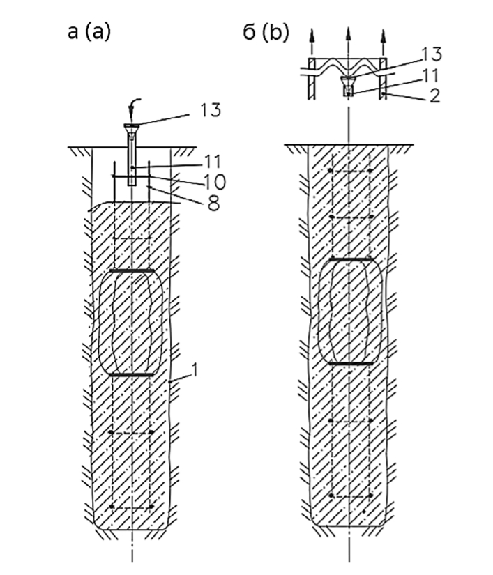 a – concreting the top pile section; b – finished open bore pile flowchart with the retrieved casing and tremie part: 1 – pile contour; 2 – retrieved casing part; 8 – reinforcing bars; 10 – crosshead clamp; 11 – tremie part; 13 – tremie funnel (developed by the authors)