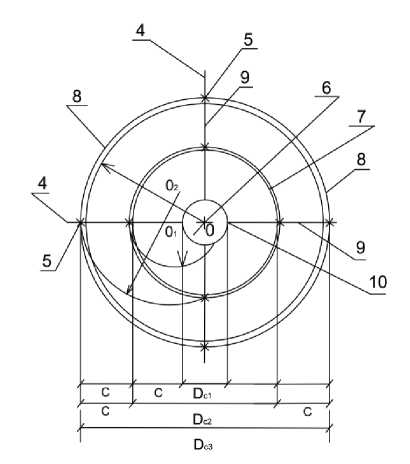 Fig. 3. Round twisted reinforcement mesh of the type of simplified spiral of Archimedes on the cross: 4 ‒ mesh fixators; 5 ‒ electric tacks; 6 ‒ central ring with diameter Dc1, mm; 7 ‒ middle turns of spiral with diameter Dc2, mm; 8 ‒ extreme turns of spiral (at least two) with diameter Dc3, mm; 9 ‒ connecting rods of the spider; 10 ‒ spot welding; O1 and O2 are the centers of the arcs of the circles connecting the turns of the spiral; С ‒ mesh size, mm