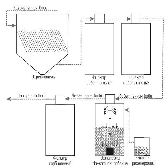 По технологии, разработанной ООО «Бантер Групп», осветленная сточная вода после прохождения через осветлительные фильтры направляется на дальнейшее умягчение с использованием Na-катионового фильтра (рис. 1).