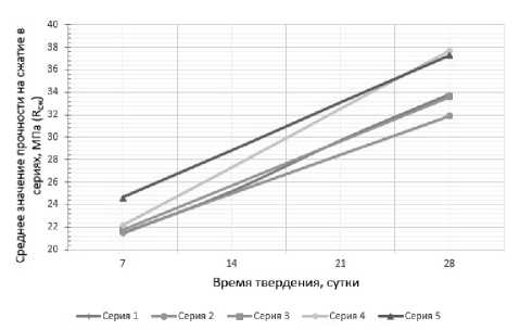 Рис. 2. Зависимость среднего значения прочности на сжатие от времени твердения (для всех серий отдельно)