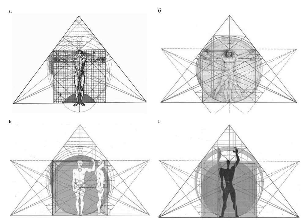Витрувий (рис. 1, а) в 1 в. до н.э. фиксирует эпоху Древнего Рима, когда в крестообразной форме фигуры человека отражалась поверхностная направленность на имперское освоение территорий по четырём сторонам света. Известно, что устройство военных поселений и городов было подчинено крестообразному пересечению двух главных направлений: север-юг (Кардо) и запад-восток (Декуманос). На рисунке плоскость квадрата изображает невидимую геодезическую сетку параллелей и меридианов на условной поверхности Земли с углом между ними в 90°. Через территориальную поверхность Земля, сообщая свою энергетическую силу, направляла человека и балансировала его активное продвижение по поверхности. Как видно из рисунка, множеством непроявленных линий-связей знания о пространстве человек получал из непознаваемой области пространства через круги практической деятельности (вокруг кистей рук) на основе ручного труда. При этом центр пространственного сознания находится между линией образов и линией сердца, осуществляя эмоциональный баланс. Круг вокруг головы, диаметр которого проходит через линию глаз, обозначает сферу зримых мыслеобразов. Через оптическое зрение образная логика (ум) пространства соединяется с уровнем знаний человека.