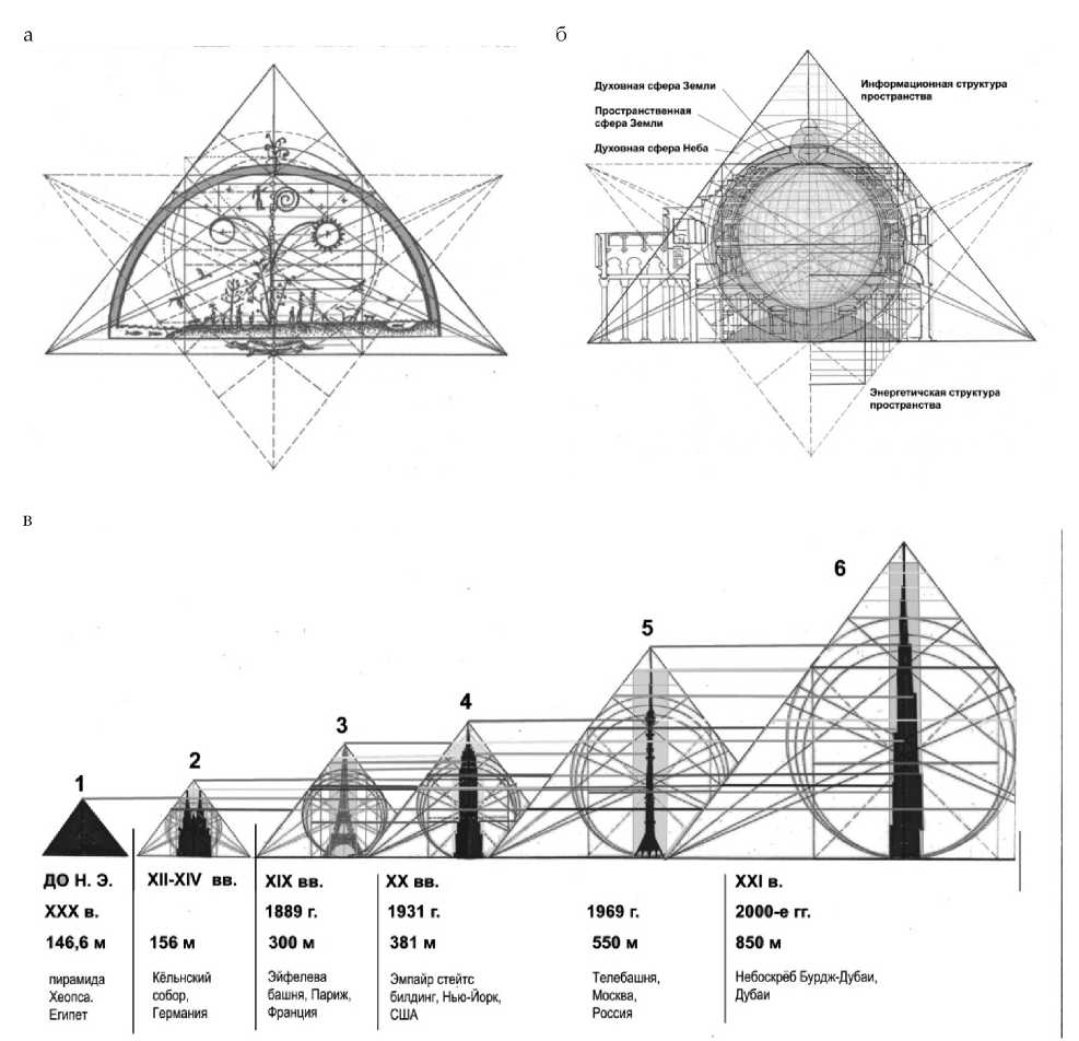 Пространственно-временная эволюция зданий и сооружений (рис. 3, в) подтверждает, что материальный мир ‒ это только «проявленный мир, ощущаемый, видимый его существами мир. Духовный же мир – не проявленный, невидимый для материальных существ, и его они могут фиксировать опосредованно, по некоторым физическим нюансам, которые наблюдаются только тогда, когда известно о возможности их проявления» [14, с. 45]. С этой точки зрения была рассмотрена картина высотных параметров в отношении сооружений с пространством [15].