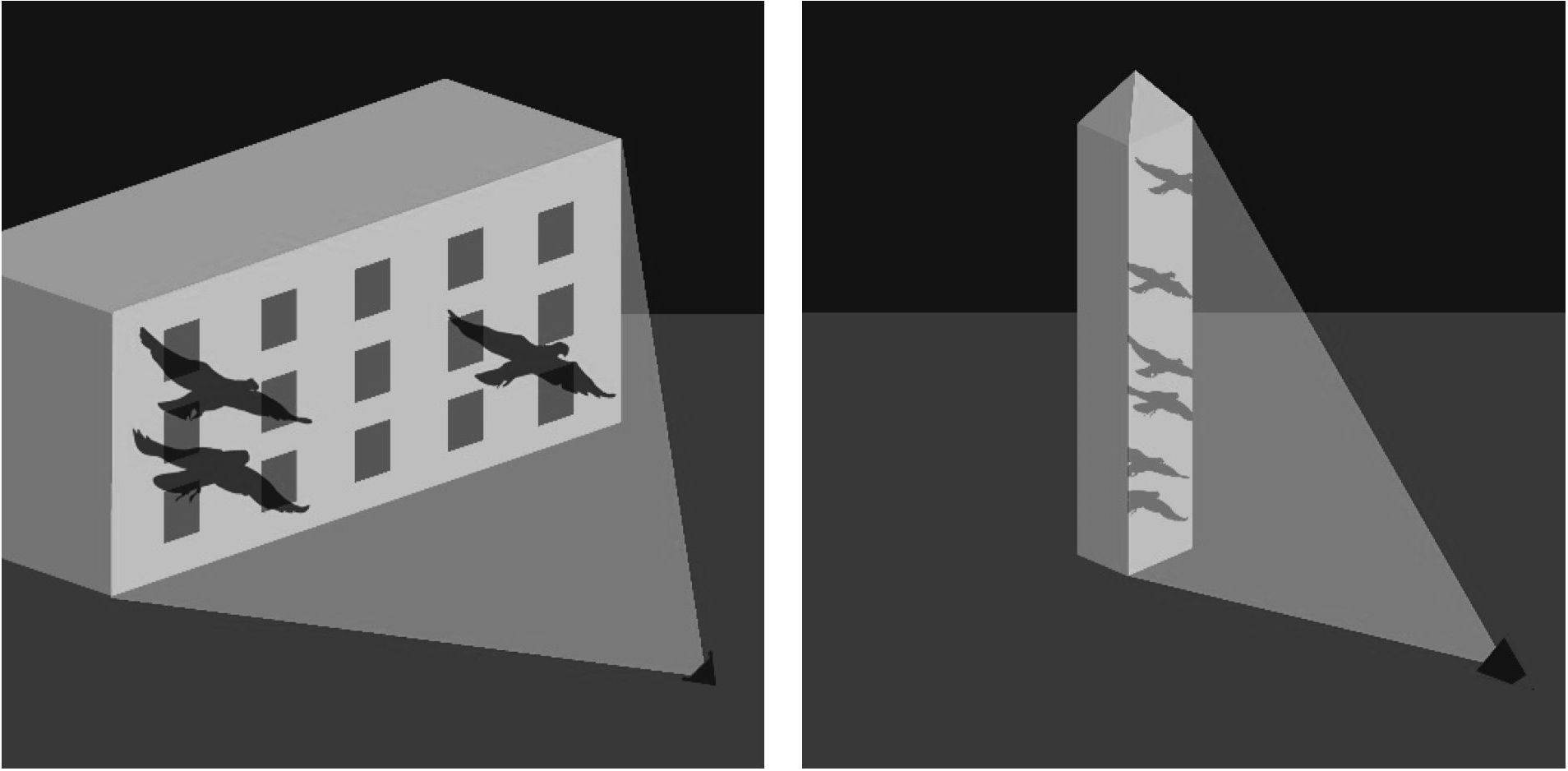 Рис. 2, 3. Иллюстративные изображения приемов проекции на фасаде и проекции на памятники/скульптуры
