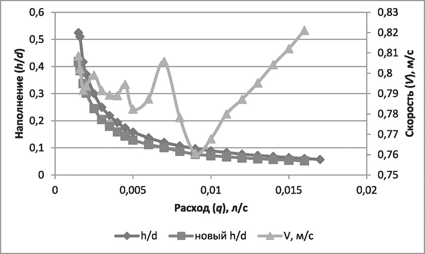 Как видно из рис. 1 и 2, скорость движения воды при изменении уклона имеет скачкообразный вид (чего явно быть не должно) при плавном изменении скорости. При снижении расхода на треть скорость снижается максимум на 16 %, т. е. примерно на одну шестую, что обусловлено спецификой безнапорного течения воды в трубах ‒ уменьшается наполнение и площадь живого сечения. Скачкообразное изменение скорости обусловлено, вероятнее всего, неточностью при определении значений по таблицам линейной интерполяцией.