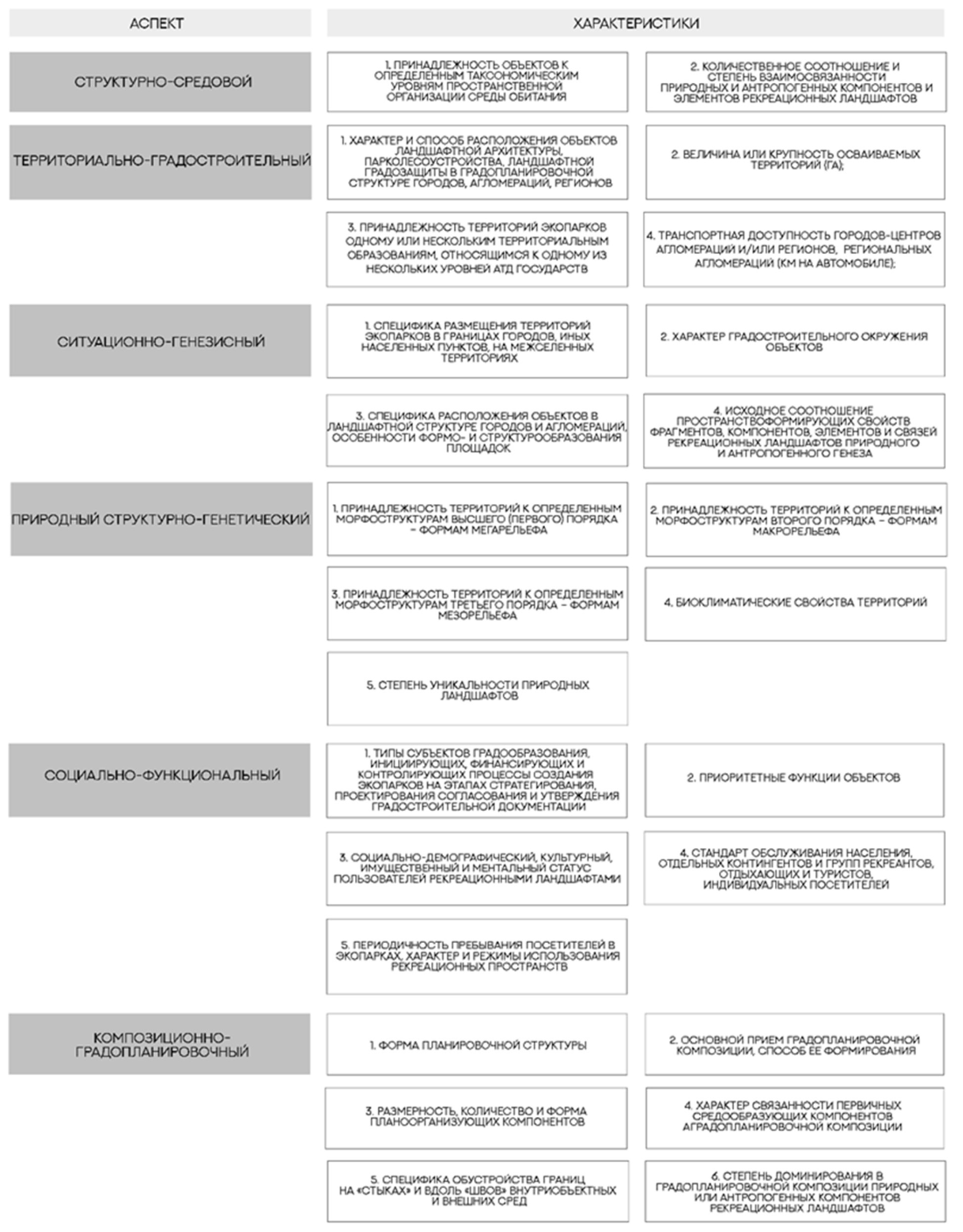 Многомерная градостроительная классификация аккумулирует в себе шесть пространствоорганизующих аспектов, в содержательных рамках которых сгруппированы основные свойства и параметры объектов изучения, а именно: