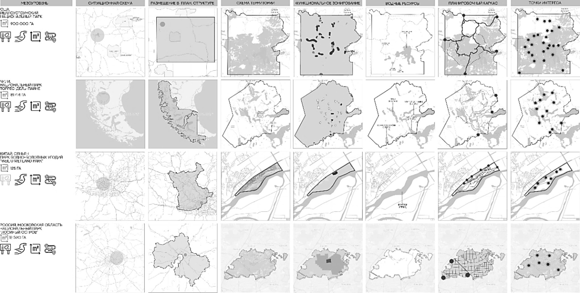 Харизматичными и точными примерами, ярко иллюстрирующими наиболее общие, уже устоявшиеся современные подходы к созданию экопарков, а также особенности проектирования их различных подтипов, стали: Йеллоустонский национальный парк (США; первый подтип), Национальный парк Торрсе-дель-Пайне (Чили; второй подтип), парки водно-болотных угодий «Weiliu Wetland Park» и «Minghu Wetland Park / Turenscape» (Китай) и «Wetland Park» (Гонконг; четвертый подтип), Национальный парк «Лосиный остров» (Московская область; третий подтип) (рис. 3–7).