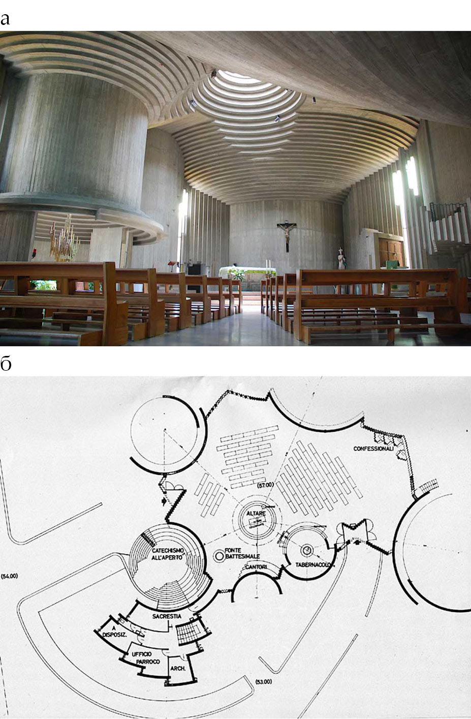 Рис. 1. Интерьер (а) и план (б) Чеза делла Сакра Фамилиа. Салерно. Арх. Паоло Портогези