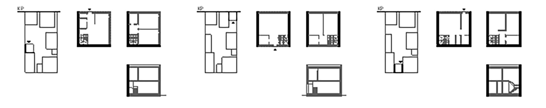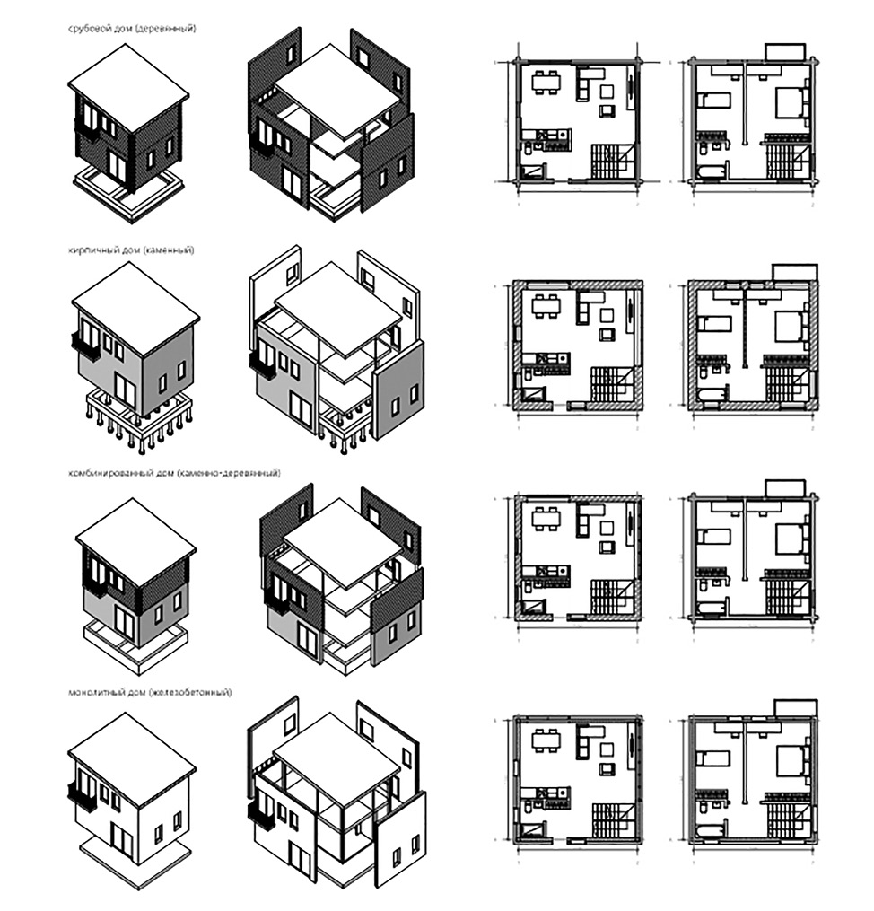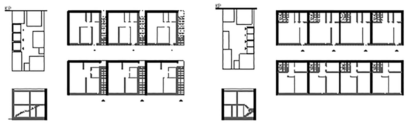 Планировочные решения домов всей предложенной типологии могут иметь квартиры в одном, двух и трех уровнях. Состав квартир по типу (одно-, двух-, трех- или четырехкомнатные) и планировочному решению (в один, два или три уровня) определяется в каждом конкретном случае. Представленный выше типологический ряд домов для реновации позволяет сформировать предложения комфортного и экономичного жилья для потенциальных собственников всех возрастных групп населения от студентов до пенсионеров. Кроме локации внутри дворовой территории, все вышеперечисленные типы домов могут быть применены для восполнения застройки по красным линиям кварталов.