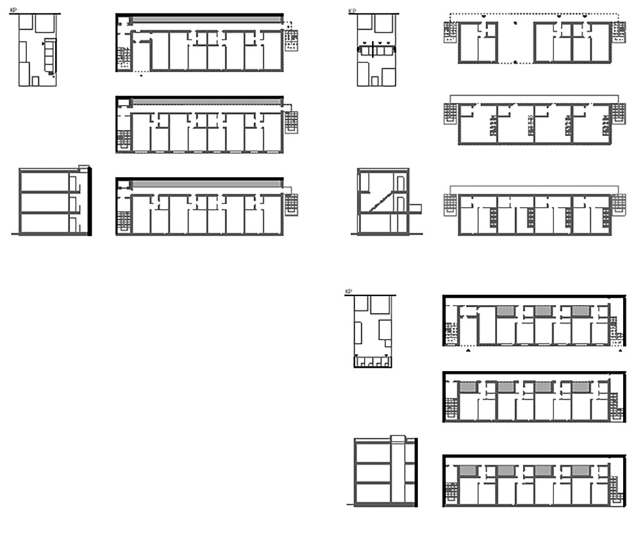 Галерейный дом. Образуется путем добавления галерейной связи и общей лестницы к блок-модулям, расположенным в ряд, начиная с трех модулей (рис. 4). Такая планировочная организация представляет собой малогабаритный многоквартирный дом. Варианты входов на первый этаж могут быть как со стороны двора с отметки земли, так и со стороны галереи. Входы в жилье на верхние этажи организованы с галереи. Стена со стороны галереи и торцевые стены могут быть глухими – брандмауэрными, что позволяет размещать объект на границе с соседними участками. Для естественного освещения пространства галерей, в случае глухих наружных стен, можно использовать верхний свет. Галерейный многоквартирный дом может быть запроектирован с широкой типологией квартир, включая квартиры повышенной комфортности в одном или двух уровнях.