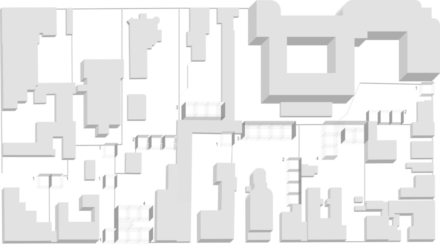 Рис. 7. Реконструкция архитектурно-планировочной структуры дворов с использованием домов на основе типовых блок-модулей: 1 – точечный дом; 2 – блокированный дом; 3 – галерейный дом; 4 – дом с лестнично-лифтовым блоком