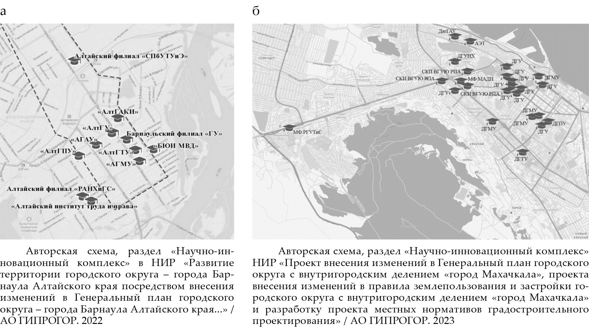 Рис. 1. Примеры размещения университетских и вузовских комплексов в структуре городских территорий региональных столиц: а ‒ Барнаул; б ‒ Махачкала