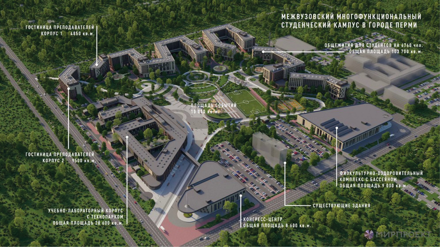 Первоначально под реализацию проекта межуниверситетского кампуса была запланирована площадь в 14 га в Камской долине для размещения четырех общежитий на 6260 студентов, одного образовательного корпуса и спортивного комплекса открытого типа. Проект рассчитан на студентов трех пермских университетов, включая Пермский государственный медицинский университет с наибольшим количеством иностранных учащихся.