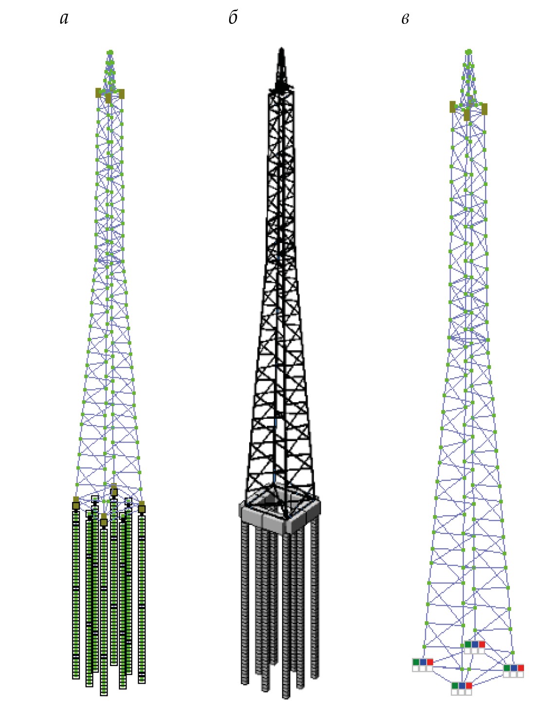 Расчет моделей мачт произведен при помощи ПК «Лира-САПР». Расчетные схемы включали в себя надземную часть мачты и сваи. Элементы мачты смоделированы КЭ10, элементы свай смоделированы КЭ57 (рис. 2). При расчете свай учтено их взаимное влияние. Также для сравнения результатов выполнен расчет мачты М1 без отклонений и без учета совместной работы свай грунтом (рис. 2, в).