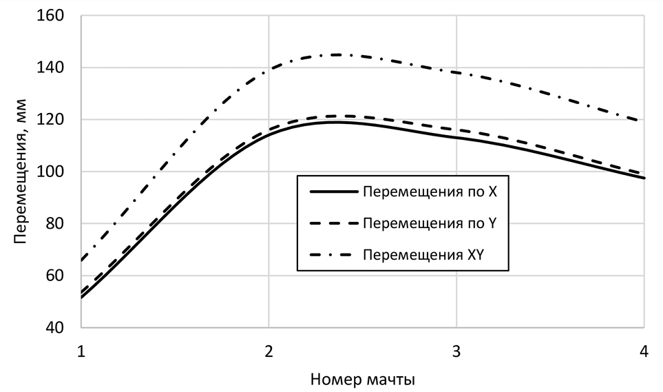Наибольшие перемещения наблюдаются при действии ветровой нагрузки по диагонали (направление «xy»). При этом начальные отклонения мачты не влияют на расчетные перемещения (мачты М2 и М3). В рассмотренных примерах мачт ни расчетные максимальные, ни суммарные с учетом отклонений перемещения не превышают предельных значений.