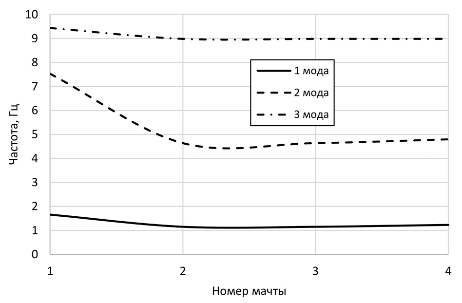 В табл. 3 и на рис. 4 приведены результаты модального анализа колебаний мачт. Первая собственная частота колебаний мачты М1 выше, чем у мачт с учетом свайного основания в расчетной схеме. Учет свай увеличивает общую податливость системы, что и приводит к уменьшению частоты колебаний. По этой же причине для мачты М4 с более длинными сваями частоты колебаний оказались выше, чем для мачт М2 и М3. Учет отклонений от вертикали не влияет на частоты и формы колебаний мачт.