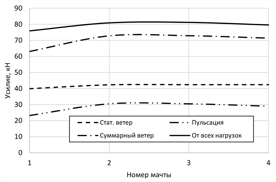 Результаты определения продольных усилий NРСУmax в самых нагруженных нижних элементах пояса мачт представлены в табл. 4 и на рис. 5. Наихудшее сочетание нагрузок то, которое включает в себя ветровое воздействие по диагонали, поэтому в табл. 4 приведены усилия от статической составляющей ветровой нагрузки Nстат.в., пульсационной составляющей Nпульс. и суммарной Nветер, а также расхождения в результатах определения данных составляющих для мачт со сваями в сравнении с мачтой М1 без свайных элементов в модели.