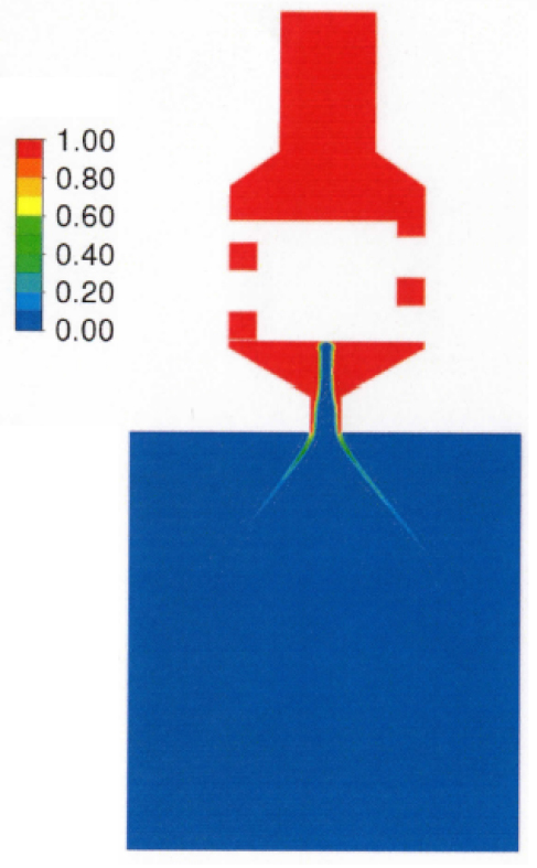 Для моделирования движения жидкости в камере смешения форсунки применялся метод объема жидкости (метод Эйлера) Volume of Fluid (VOF) [8]. В качестве параметра, отражающего картину двухфазного течения, здесь применяется параметр объемной доли жидкости в ячейке С (если С = 1, то ячейка заполнена жидкостью, если С = 0, то ячейка заполнена газом). Граница раздела ‒ ячейка с параметром С = 0,5.