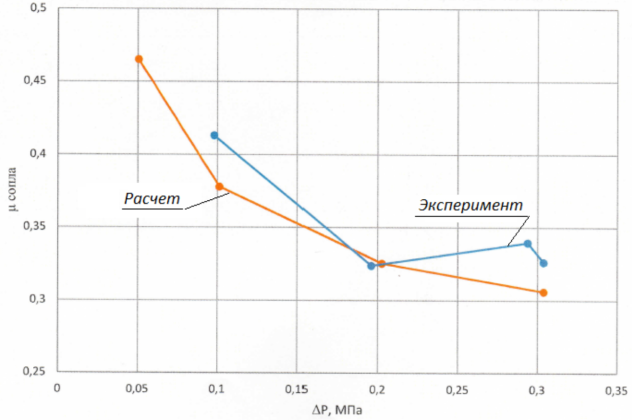 На рис. 9 показана расходная характеристика исследуемого варианта форсунки, вычисленная весовым методом в натурном эксперименте [6], и расходная характеристика форсунки из CFD-моделирования.