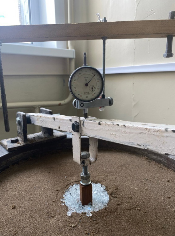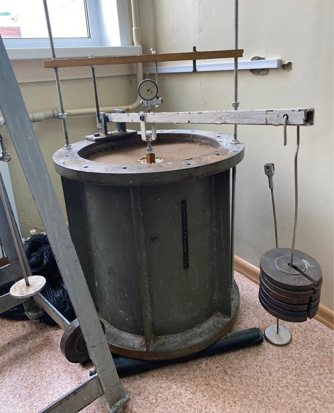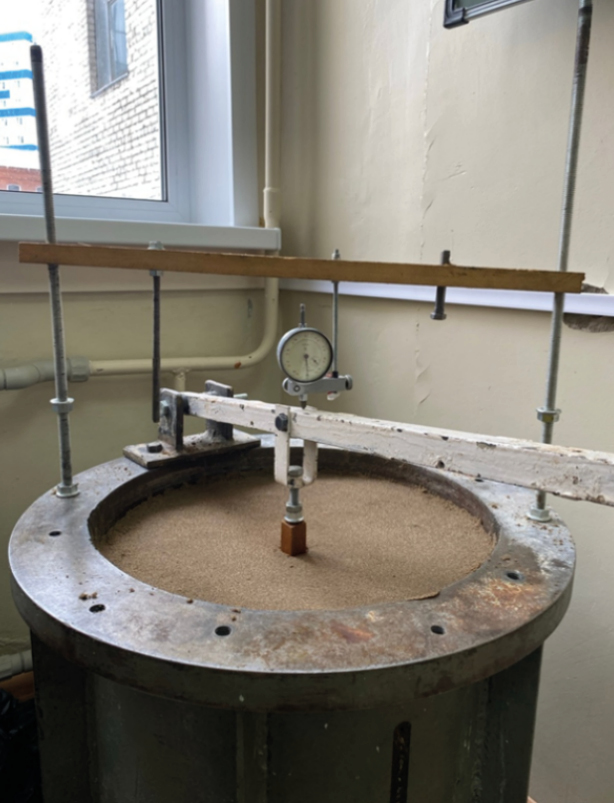 Все исследовательские работы по повышению несущей способности забивной сваи за счёт повышения прочности околосвайного пространства проводились в лабораторных условиях в грунтовом лотке, имеющем диаметр 410 мм, глубину 500 мм. Модельным грунтом являлся песок мелкий, смешанный с машинным маслом (имитирующим влажность), плотностью 1,75г/см3 [7]. Модельные сваи в количестве двух штук изготовлены из дерева, с размерами постоянного поперечного сечения 15×15 и 20×20 мм, длиной 220 мм. Щебень, как элемент улучшения околосвайного пространства, имеет фракцию 3–5 мм, стекло представлено в виде крошки с размером частиц также 3–5 мм. Нагружение сваи производилось через рычажную систему ступенчатой нагрузкой, ступенями по 20 Н, а вертикальное её перемещение фиксировалось индикатором часового типа с ценой деления шкалы 0,01 мм (ГОСТ 5686–2020 «Грунты. Метод полевых испытаний сваями»). Лабораторная установка показана на рис. 1.