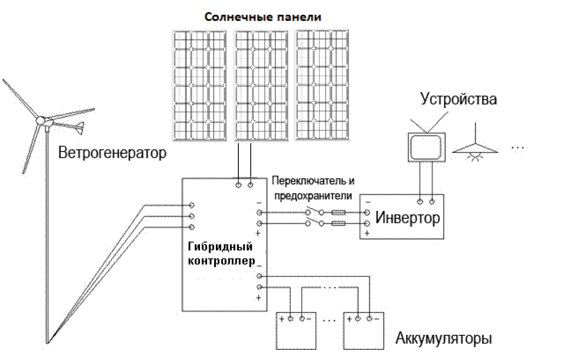 В состав гибридных систем энергосбережения входят ветрогенераторы, солнечные панели, инвертор, контроллер и накопитель заряда. В зависимости от конкретных потребностей потребителя и особенностей расположения объекта характеристики каждого из компонентов подбираются индивидуально.