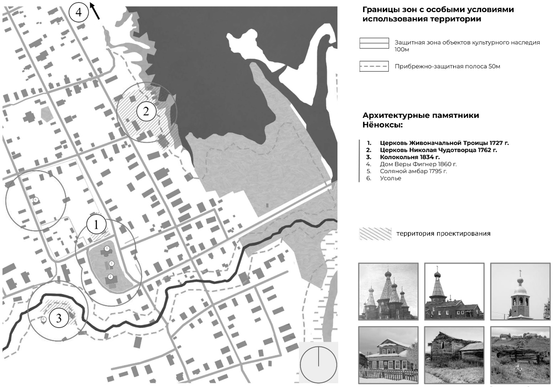 В результате сочетания историко-культурного и ландшафтно-визуального анализа села Нёнокса были выявлены наиболее перспективные площадки для размещения туристической инфраструктуры, отмеченные на рис. 2: