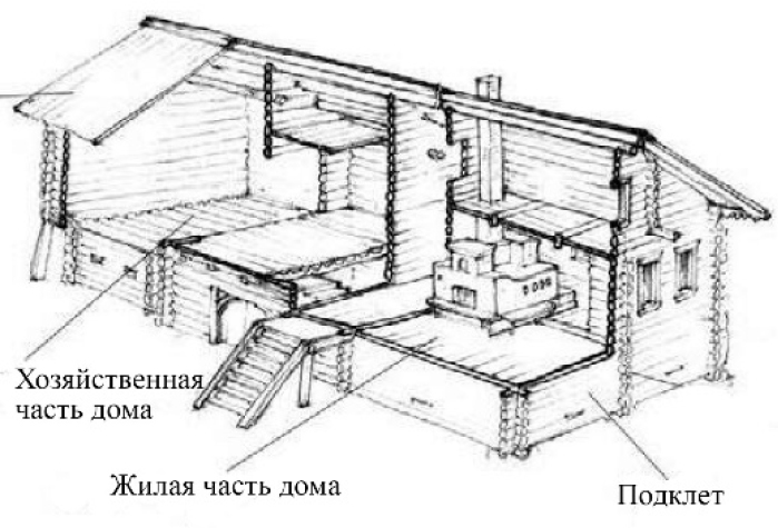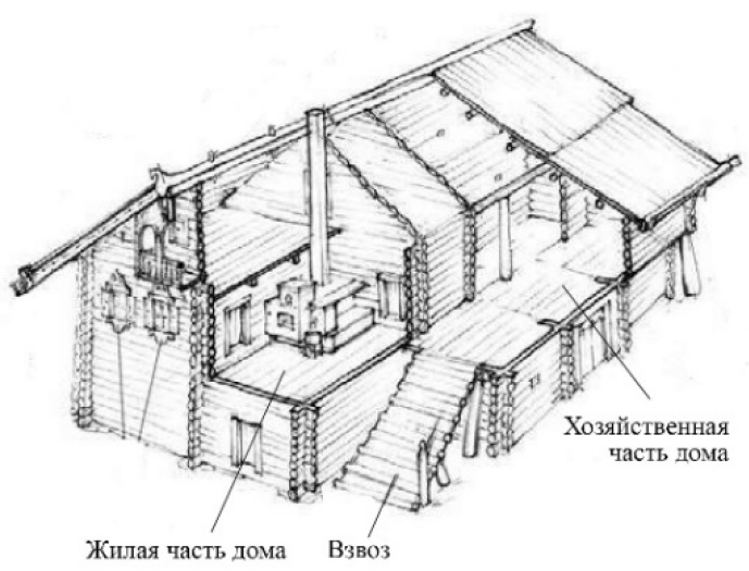 Дом «брусом» Дом длинный узкий, части строения расположены друг за другом: жилая с боковым крыльцом, хозяйственный двор, сарай или дровня. На многих домах ‒ выпускное окно на крыше («вышка») в жилое летнее помещение либо часть повети | ||