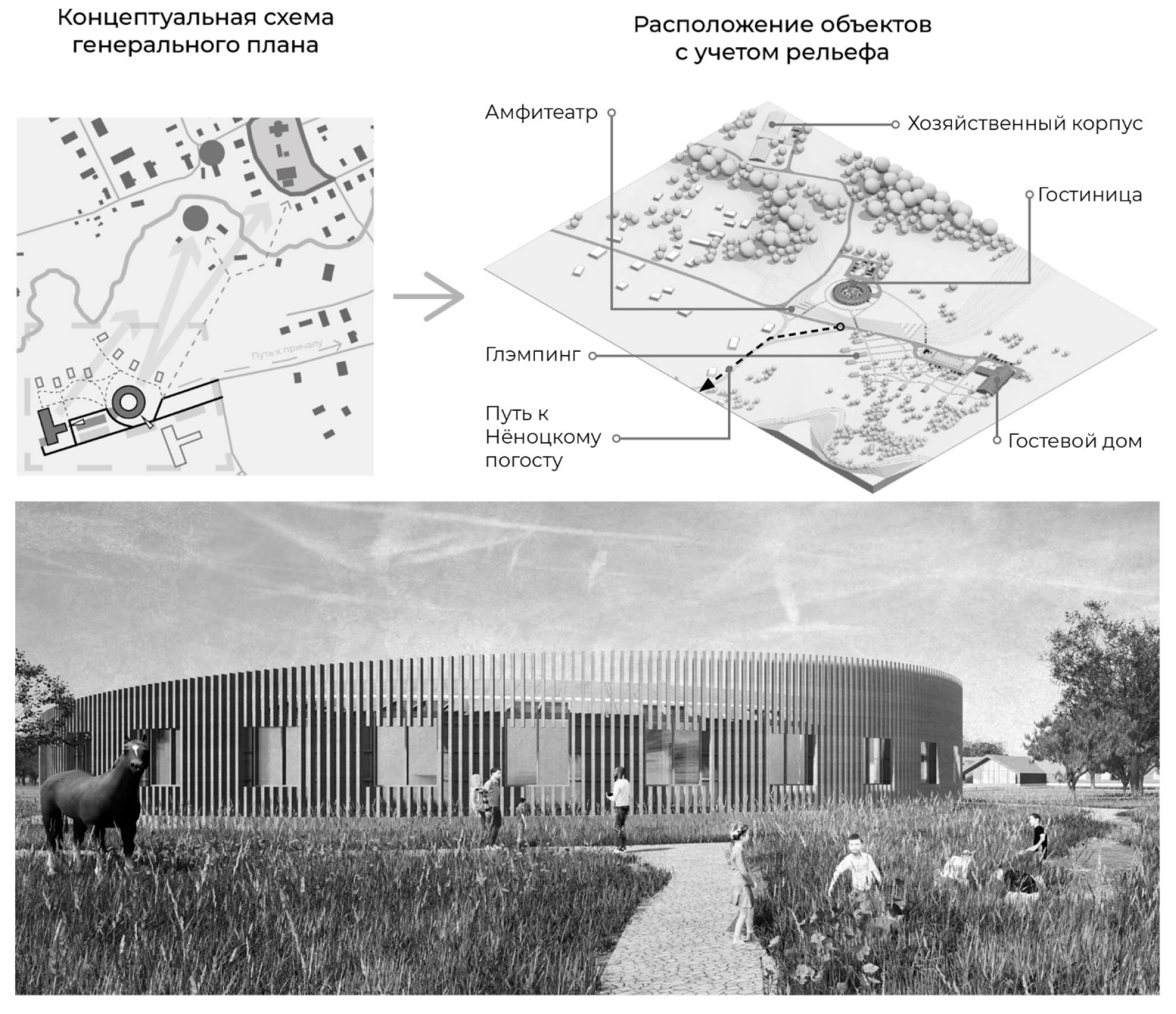Fig. 5. Project proposal for a tourist complex in the village of Vorzogory (authors S. Trebis, I. Rezaykin, I. Petchenko, S. Kuzmina, A. Vikarchuk)
