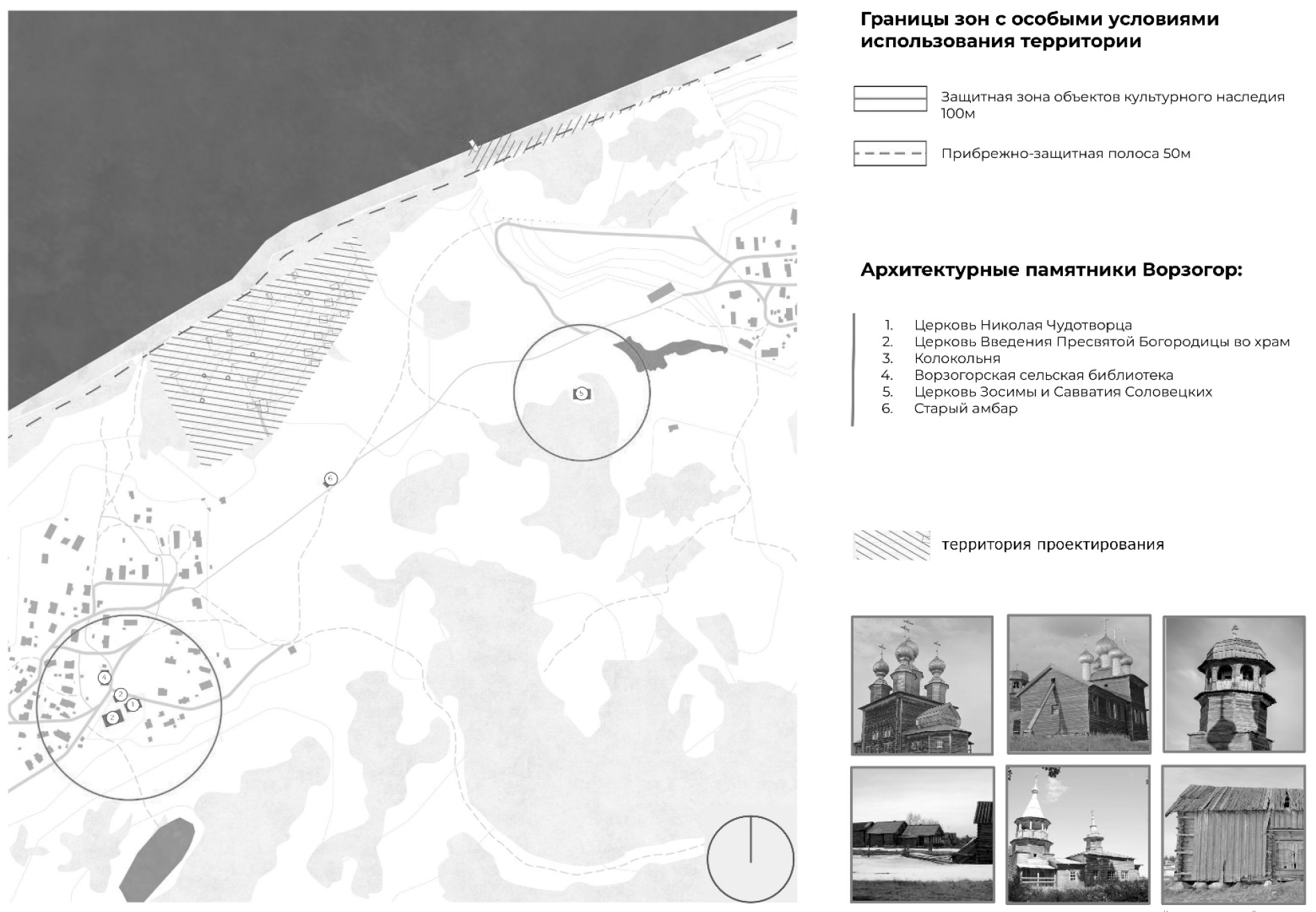 В качестве перспективной площадки для развития туристической инфраструктуры в селе Ворзогоры выбрана территория на свободном пространстве между Яковлевской и Кондратьевской деревнями, чтобы сохранить видовые характеристики сложившегося ансамбля деревянных построек (рис. 4). Архитектурные решения здесь необходимо композиционно связать с характерным ландшафтом берега Белого моря.