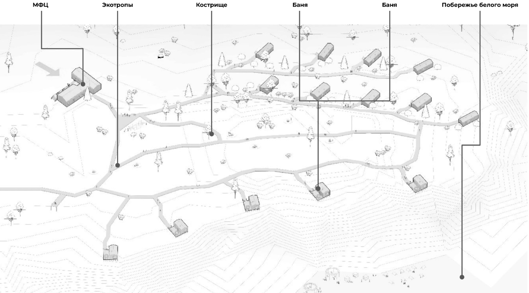 Рис. 5. Проектное предложение по туристическому комплексу в с. Ворзогоры (авторы С. Требис, И. Резайкин, И. Петченко, С. Кузьмина, А. Викарчук)