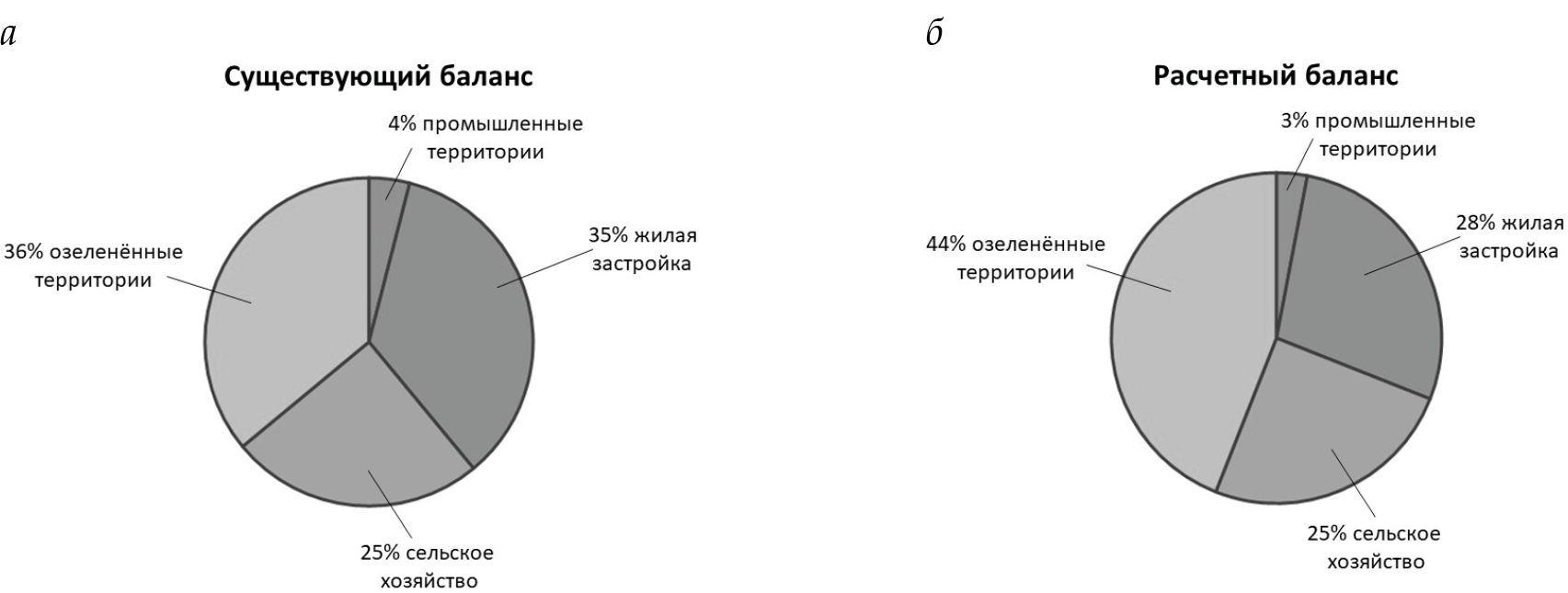2. Fig. 1. The scheme of the balance of the territory of the Moscow region in terms of land area, taking into account the needs of the population in housing and production: a ‒ the existing balance of the territory; b ‒ the calculated balance based on the principle of biospheric compatibility