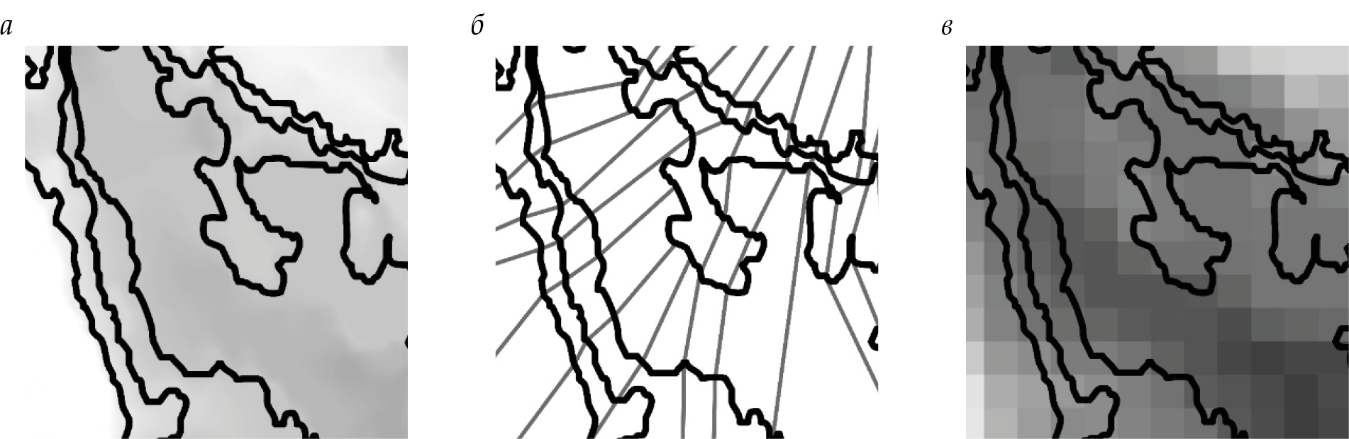 Рис. 1. Этапы анализа и оценки рельефа территории. Выделение площадок под жилую застройку: a ‒ строится генерализованный рельеф местности; б ‒ строится схема распределения территории по уклонам; в ‒ строится результирующая сводная планограмма