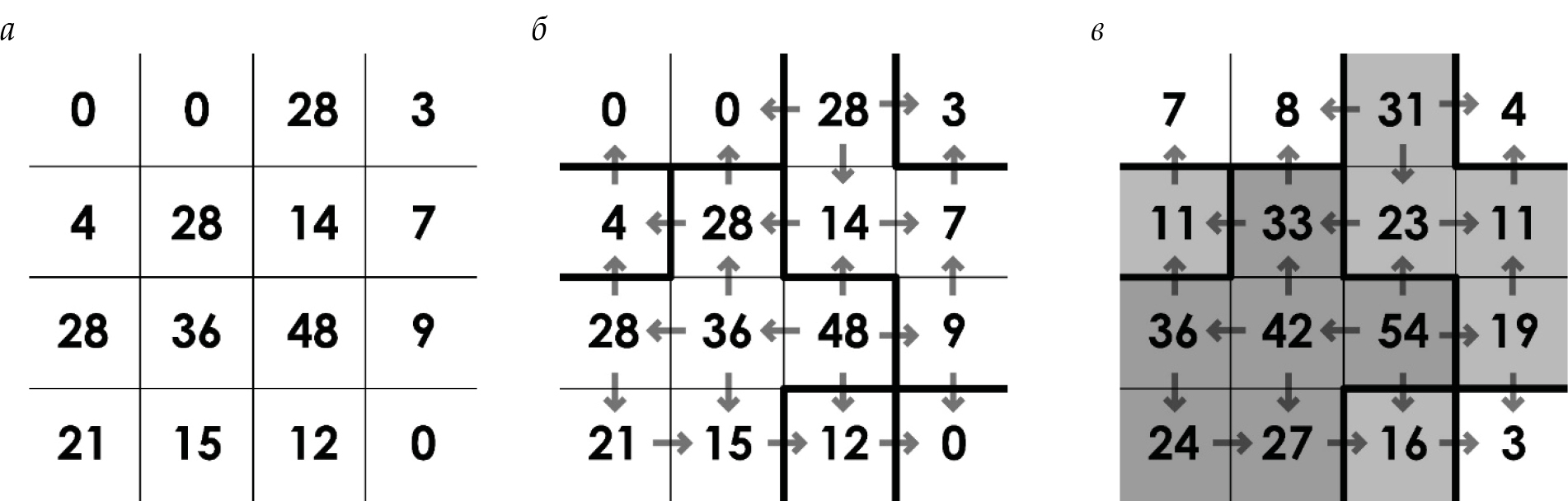 Рис. 4. Этапы анализа и расчета плотности объектов: a ‒ выполняется сбор сведений о размещении объектов на территории; б ‒ строится планограмма; в ‒ выполняется дисперсный расчет значения в каждой ячейке