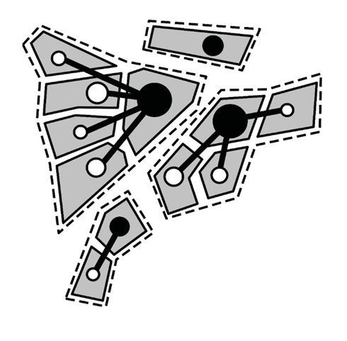 Данные о связях между районами заносятся в матрицу, где фиксируются наиболее значимые потоки для каждого района отправления. Центральными точками системы становятся зоны, куда поступают максимальные объемы потоков, превышающие исходящие из этих зон. Это позволяет не только распределить зоны по рангу их связности, но и выделить в структуре города планировочные районы (рис. 7).