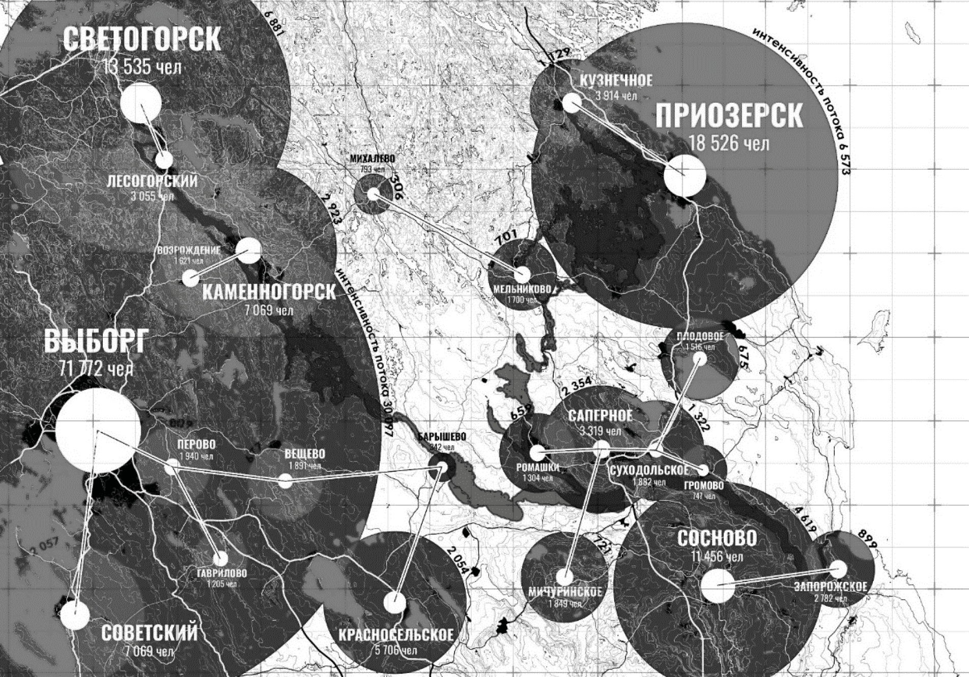 Затем районы связываются друг с другом векторами. Визуализация этих связей на карте позволяет наглядно отобразить степень и структуру связей между разными районами, а также интенсивность потока, входящего в каждую из зон. Такая иерархическая организация иллюстрирует узловое устройство территории города, определяет его пространственную структуру и отражает относительную значимость различных внутренних потоков.