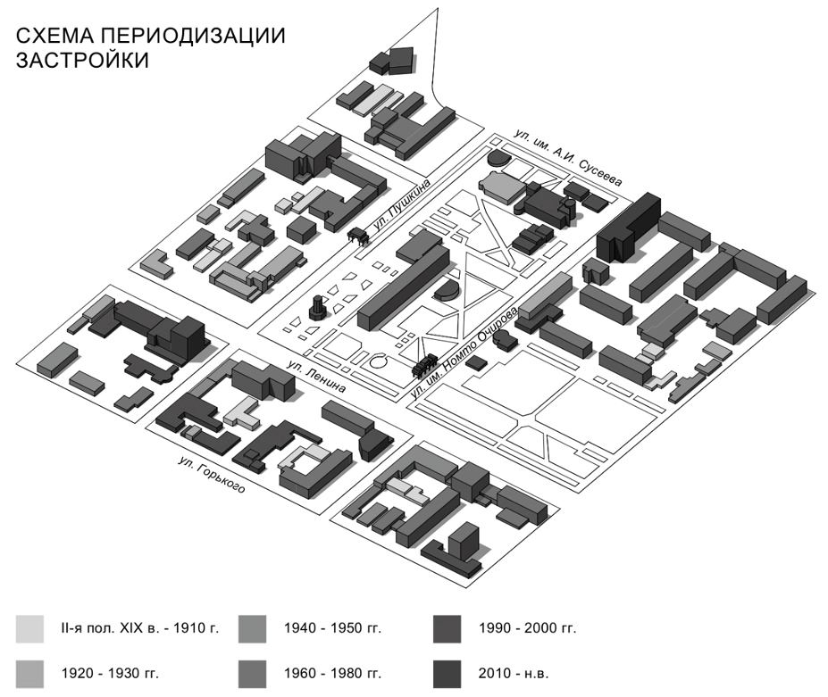 Fig. 6. Scheme of periodization of building of the central part of Elista (author’s scheme)