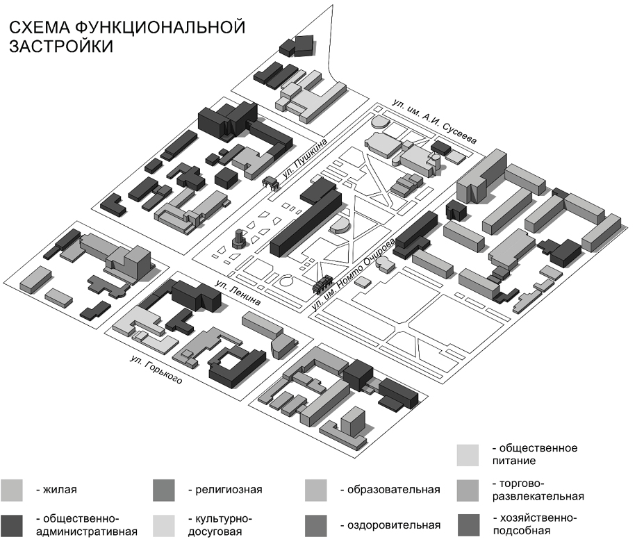 Рис. 7. Схема функционального зонирования застройки центральной части Элисты (авторская схема)