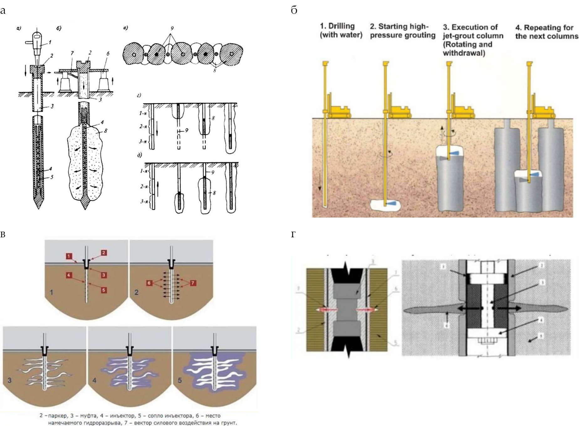 Рис. 1. Технологии инъекционного закрепления грунтов: а ‒ режим пропитки; б ‒ струйная цементация; в ‒ гидроразрывы; г ‒ манжетная технология
