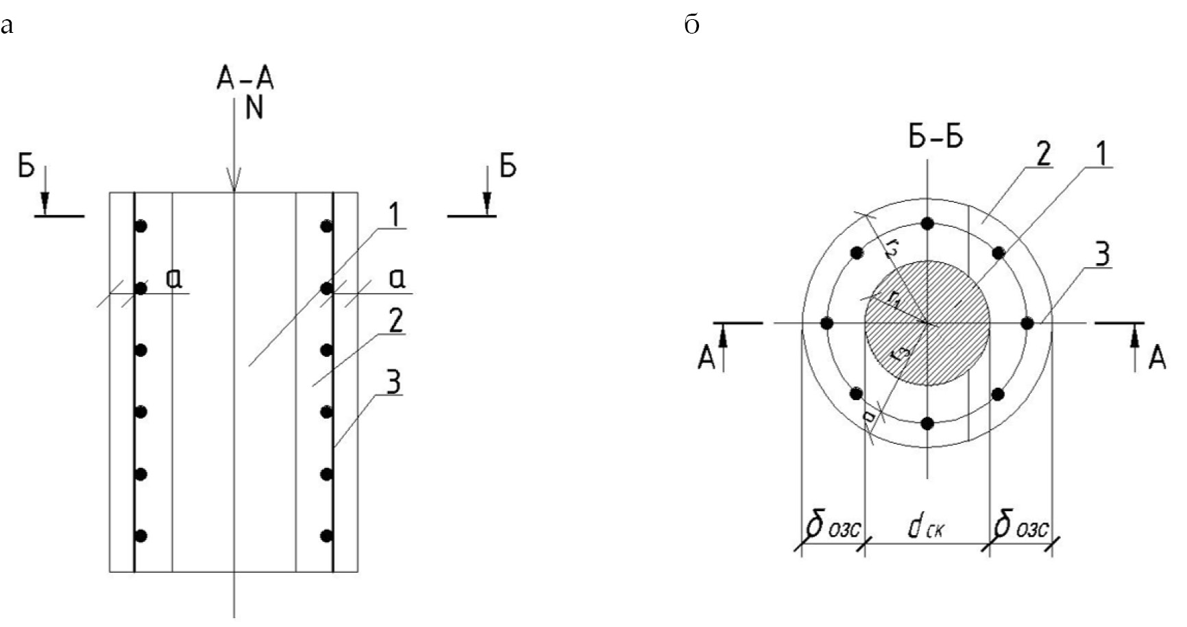 Рис. 2. Схема армирования огнезащитного покрытия оголовка (Ø 300 мм) и средней части чугунной опоры (Ø 200 мм): 1 – существующая чугунная опора; 2 – огнезащитное покрытие толщиной 50–100 мм; 3 – продольная арматура 4Ø20 + 3Ø12; 4 – гнутые хомуты Ø4–6 мм; δозс – толщина огнезащитного покрытия 50–100, мм; N – нагрузка на реконструируемую чугунную опору