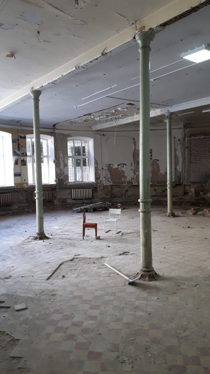На фотоснимке приведен обзорный вид участка расположения двух чугунных опор круглого зала Академии строительства и архитектуры в момент разборки пола и подготовки к осмотру реконструируемых чугунных опор, на которые опираются металлические балки в виде двутавра № 18 перекрытия круглого зала: высота опор L = 4 м; размер сечения ствола чугунной опоры L = 200 мм; верхнего оголовка L = 300 мм (рис. 1).