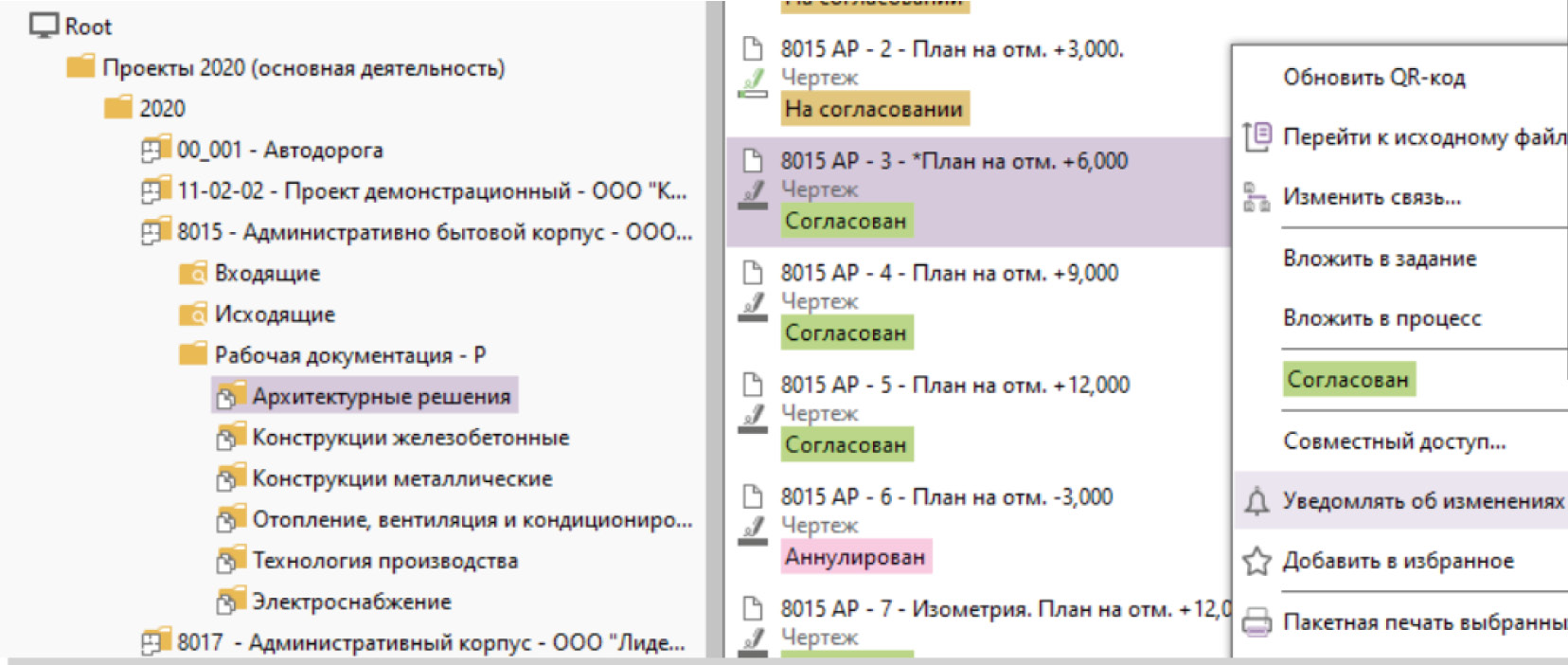 Система Pilot-BIM от разработчика АСКОН обладает рядом функций для решения задач по подготовке 2D-документов. В том числе система позволяет задавать определённый статус документам, который будет виден всем участникам проекта: «согласовано», «аннулировано», «на согласовании» (рис. 4).