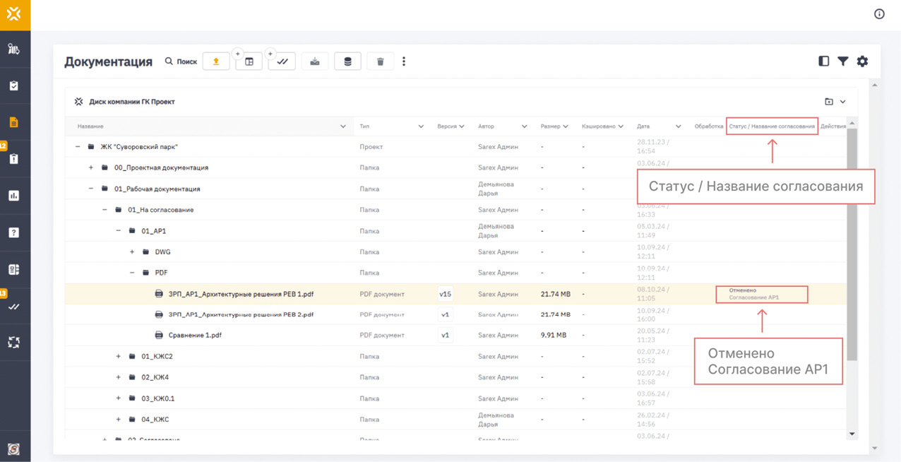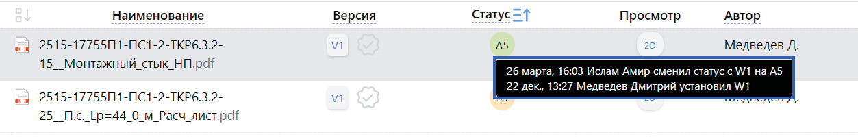 При работе с документацией в среде общих данных SAREX статусы имеют похожую структуру и связаны с этапами согласования определенной версии документа, присутствует идентификатор согласования, что позволяет более точно определить, какой участник проекта и на каком этапе подготовки документации изменил статус (рис. 5).