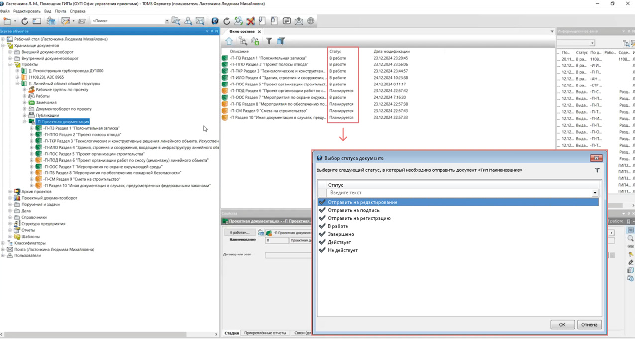 В системе TDMS Фарватер статус является одним из свойств (атрибутов) каждого информационного объекта. В зависимости от статуса определяются права доступа разных сотрудников к объекту, а также список возможных действий с объектом (рис. 6).