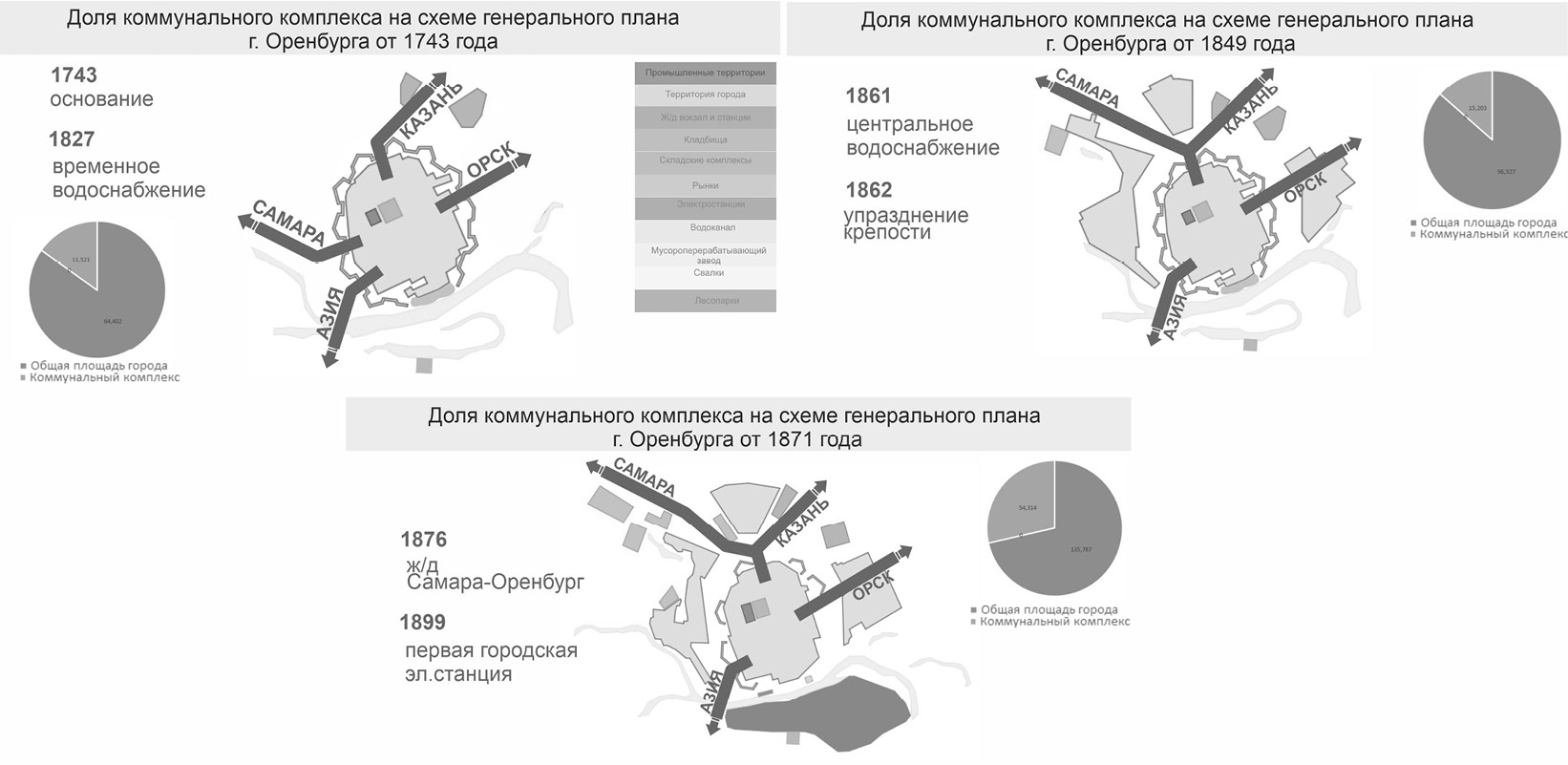 Fig. 1. Layout of the municipal complex of the city of Orenburg 1743, 1849 and 1871, with the identification of their share in the total balance of urban areas