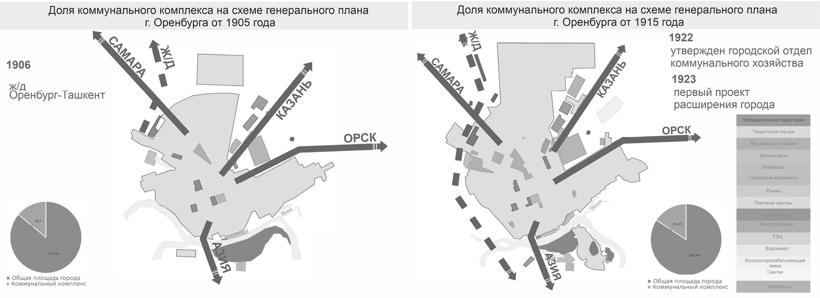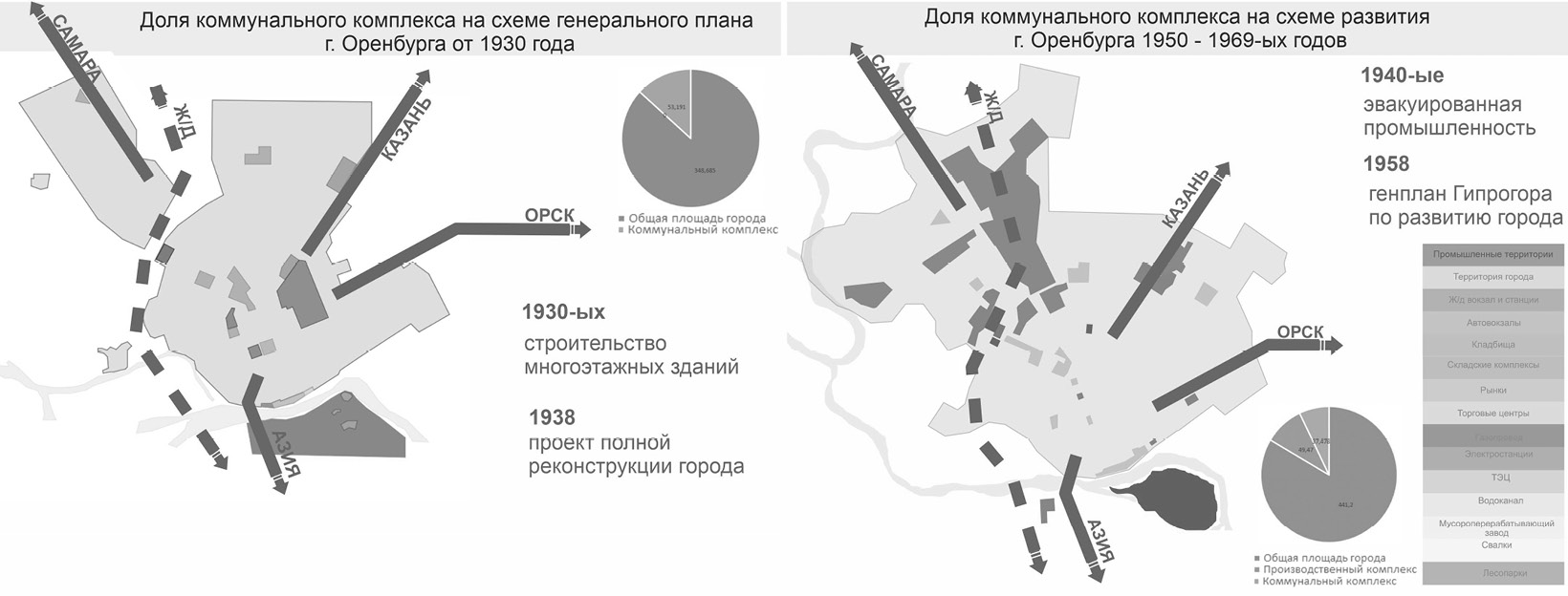 Рис. 3. Схемы размещения объектов коммунального комплекса города Оренбурга 1930 и 1950–1969 гг. с выявлением их доли в общем балансе городских территорий
