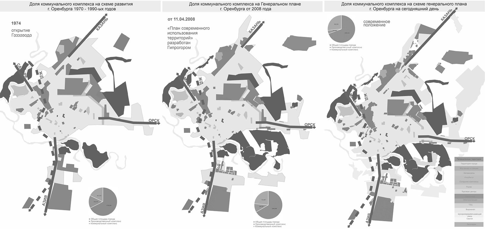 Рис. 4. Схемы размещения объектов коммунального комплекса города Оренбурга 1970 – 1990 гг., 2008 г., современного состояния с выявлением их доли в общем балансе городских территорий